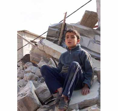 Ein palästinisches Kind auf den Ruinen seines Hauses, das in Gaza durch die israelischen Truppen zerstört wurde.