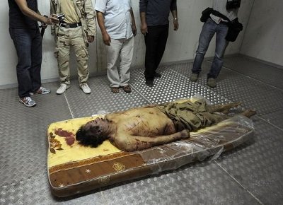 Más todavía, y al contrario que las del embajador estadounidense, las imágenes del antiguo «Guía» libio, masacrado y después exhibido como un trofeo de caza junto a su hijo coparon la red y las portadas de los telediarios de todo el planeta.