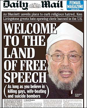 La primera página del Daily Mail en contra de la llegada de al-Qaradawi en Gran Bretaña