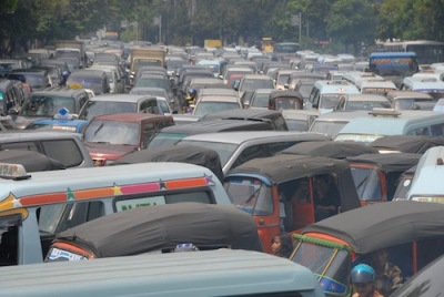 La stupidité de l’aménagement de la ville ne peut être seulement égalé par l’imbécilité du développement du pays dans son entier -Jakarta est un microcosme. Pour faire un demi-tour, on doit souvent conduire pendant un kilomètre ou plus, ajoutant des embouteillages, de la consommation d’essence et de pollution. Mais la ville est conçue de sorte que même pour traverser la route, il faut souvent conduire car il n’y a presque pas de trottoirs dignes de ce nom ou de passages piétons. Rien n’est connecté ici et quoique il arrive, nous devons utiliser une voiture ou un scooter"populaire", bon marché et polluant (les locaux les surnomment désirables’motos’) et puis pourrir dans un macet -le légendaire nom des embouteillages indonésiens- car le lobby automobile a réussi à acheter et corrompre plusieurs couches du gouvernement, avec pour conséquence d’empêcher qu’il y ait un réseau de transport en commun efficace.
