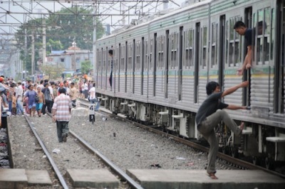 Quelques membres de ’la classe moyenne’ jakartanaise montent sur les toits des trains parce ils n’ont pas les moyens de payer le prix d’un ticket ; plusieurs personnes sont electrocutés chaque année, d’autres chutent mortellement. Pour les empêcher de monter sur les trains, le gouvernement compréhensif a commencé à accrocher des boules de béton au dessus des voies pour casser les cranes et à les arroser avec des liquides colorés, même avec des excréments. Plusieurs stations y compris Manggarai, ont posé des fils de barbelés acérés sur les toits des plate-formes, ainsi les gens qui essayant de sauter, peuvent être déchiquetés.